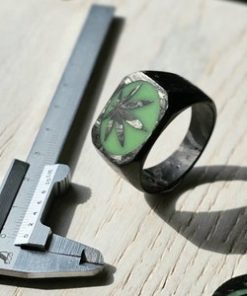 Glow in the dark cannabis leaf signet ring, forged carbon fiber
