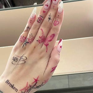 5Pcs Y2K Finger Temporary Tattoo, Pink Black Hand Sticker, Trendy Star Butterfly Body Art | These Y2K finger tattoos feature trendy star and butterfly designs in pink and black. Easy to apply, they add a stylish touch to your hands.