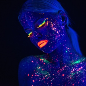 Body art UV fluorescent paint | This UV fluorescent body paint glows under blacklight for bold creative designs. Easy to apply, it’s perfect for festivals, raves, and parties.