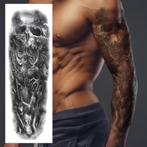 Devil Skull Mountain Temporary Tattoo Sleeve – Death Evil Full Arm Black Grey Waterproof Transfer for Men Women Kids Fancy Dress Fake Tattoo | This devil skull sleeve tattoo features a bold full-arm black and grey design. Waterproof and realistic, it’s perfect for costumes and events.