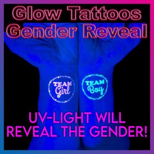 Gender Reveal Party Tattoos – UV blacklight reactive Glow in the Dark Tattoos – Fluorescent neon temporary tattoos – It’s a boy/girl tattoo | These gender reveal tattoos glow under UV light for a fun celebration. Easy to apply, they add excitement to your party.