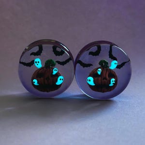 Handcrafted Haunted Pumpkin Plugs – Blue Glow-in-the-Dark, Halloween, 8mm–50mm | These handcrafted pumpkin ear plugs glow blue in the dark for a spooky Halloween style. Comfortable and unique, they are perfect for festive wear.
