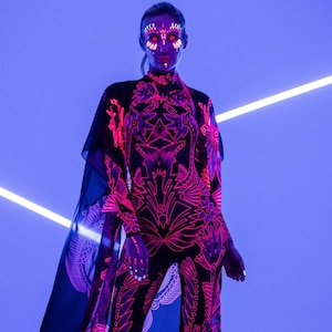 NEON FLOWERS FLUORESCENT Black Catsuit & Kimono Set, Festival Full Outfit, Rave Set, Halloween Costume, Mesh Catsuit, Pink Neon Clothing | This neon floral catsuit and kimono set glows under UV light for a bold festival look. Perfect for raves or Halloween, it offers a stylish and eye-catching outfit.