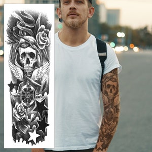 Pirate Skull Temporary Tattoo Sleeve – Black Star Full Arm Black Waterproof Transfer for Men Women Kids Halloween Fancy Dress | This pirate skull tattoo sleeve covers the full arm with bold black star details. Waterproof and realistic, it’s perfect for costumes and events.