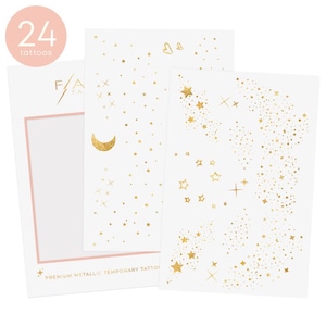 PIXIE DUST Flash Tattoos 2 sheet pack | metallic temporary tattoos | freckle tattoo | glitter tattoo | metallic face sparkle | These pixie dust flash tattoos include metallic and glitter designs for a sparkling look. Easy to apply, they are perfect for parties and festivals.