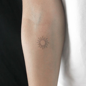 Small Sun By 1991.ink Temporary Tattoo (Set of 3) | This small sun temporary tattoo set offers a minimal and elegant design. Easy to apply, it’s perfect for subtle everyday body art.