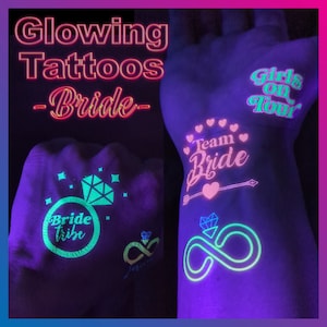 UV Schwarzlicht Reaktiv Glow in the Dark Party Tattoos – Braut Tattoos – Fluoreszierende Neon temporäre Tattoos – JGA, Festival, bach party | These UV reactive glow in the dark tattoos shine brightly under blacklight for parties and festivals. Perfect for bridal events, they add a fun and vibrant neon touch.